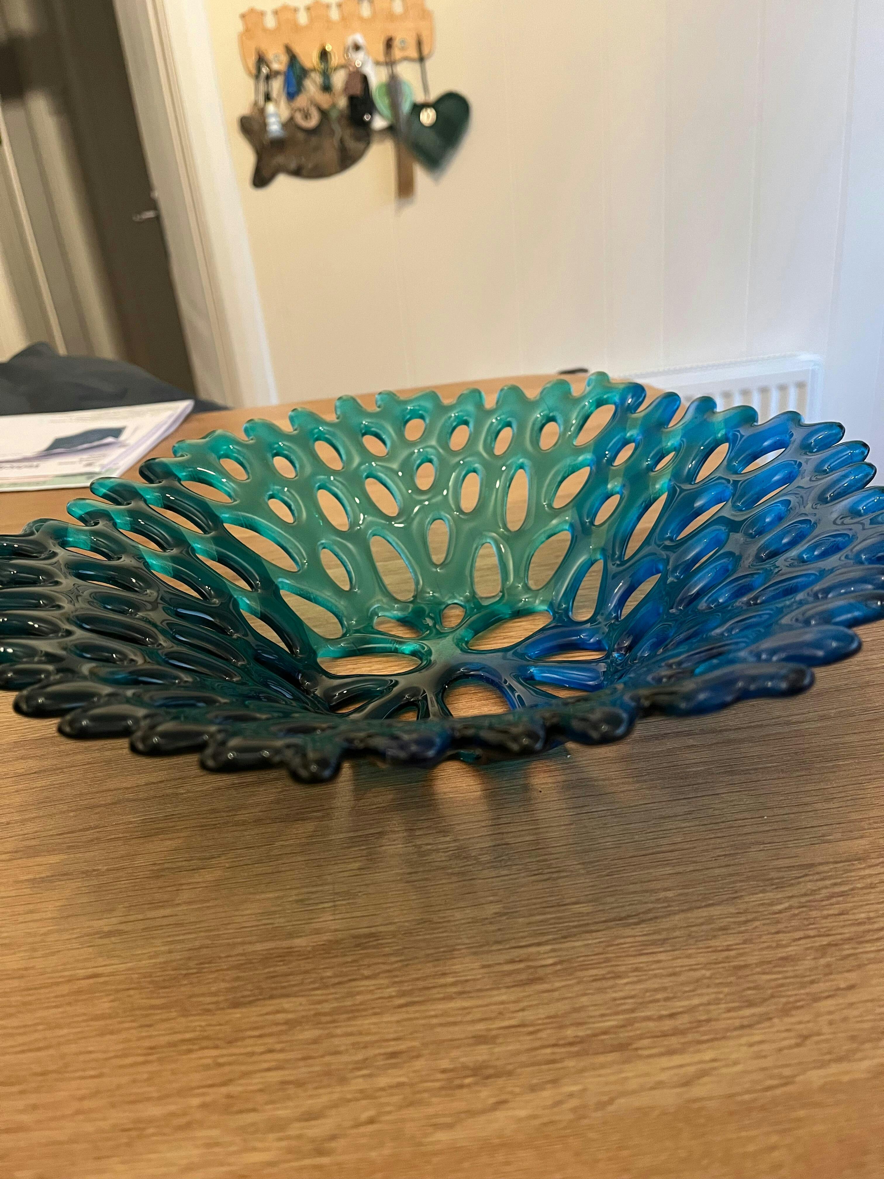 This unusual blue coral glass bowl makes a fantastic colourful feature in any home. When the sun is shining it casts a beautiful coloured shadow across the surface.