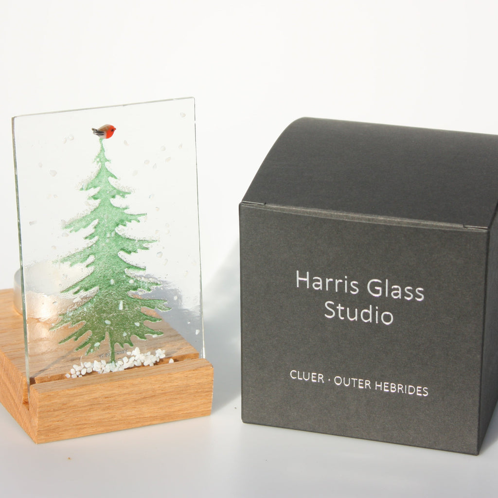 This is a candle screen of a Christmas tree with snow falling in the background and the robin on top. The glass is clear to let the light shine through and there is space on the wooden stand to put a tea light.